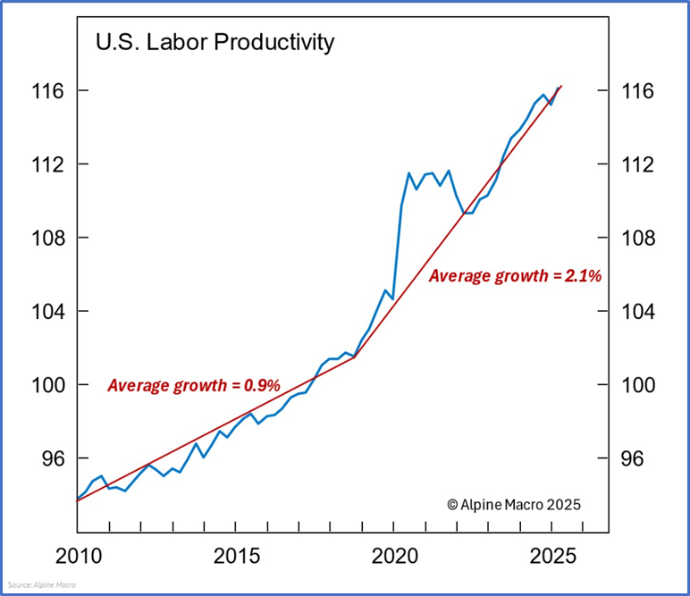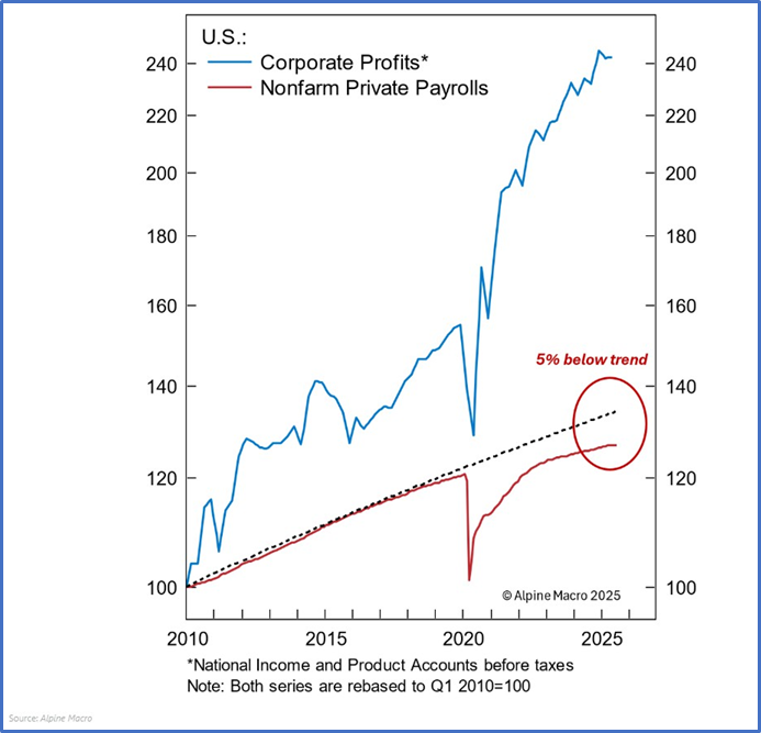 US labor productivity has accelerated from an average growth of 0.9% to 2.1% (left chart). This means that companies are able to provide more goods/services for the same level of cost or provide the same level of goods/services at a lower cost. Either way, it causes corporate profits to increase. In fact, nonfarm private payrolls are still approximately five percent below trend from 2010. This means that technology has supplanted these jobs. With the increasing convergence of artificial intelligence and robotics, we envision that technology will continue to allow businesses to reduce labor costs relative to their sales; increasing their margins.