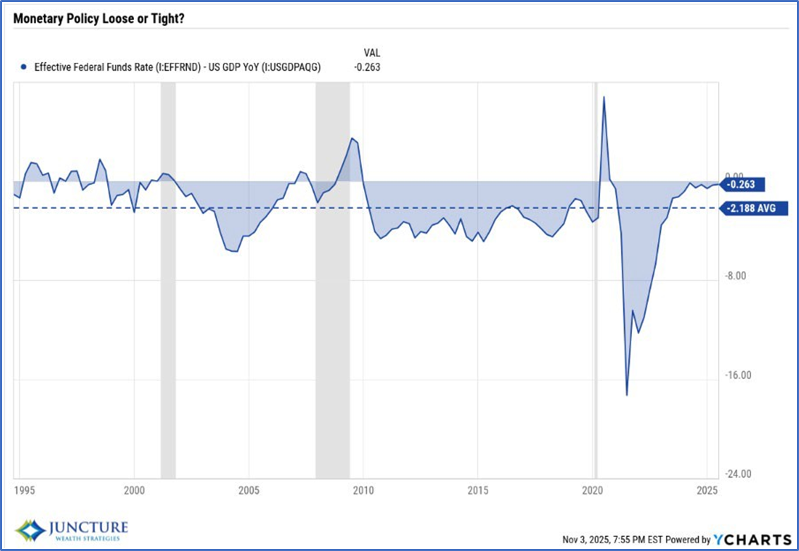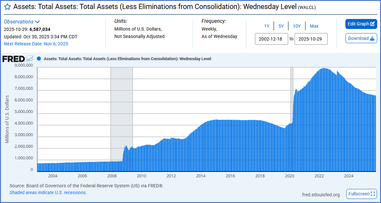 The Federal Reserve announced its intention to cease shrinking its balance sheet beginning in December. What impact will this action have on the economy? Generally, quantitative tightening takes money/liquidity out of the financial system. Liquidity is crucial to the normal functioning of the economy and financial markets. The Fed has taken approximately $2.5 trillion out of the system since 2022. Taking excess liquidity out of the system may have contributed to our recent low inflation rate.