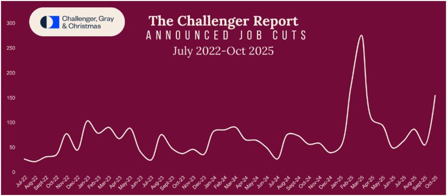Challenger, Gray & Christmas, a leading executive outplacement and coaching company, tabulates statistics on the labor market. Its most recent release reported 153, 074 jobs in October 2025 versus 55,597 in October 2024. The most cited reasons for these cuts included DOGE impact, artificial intelligence (AI), softening consumer/corporate spending, and rising costs.