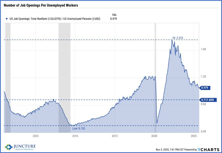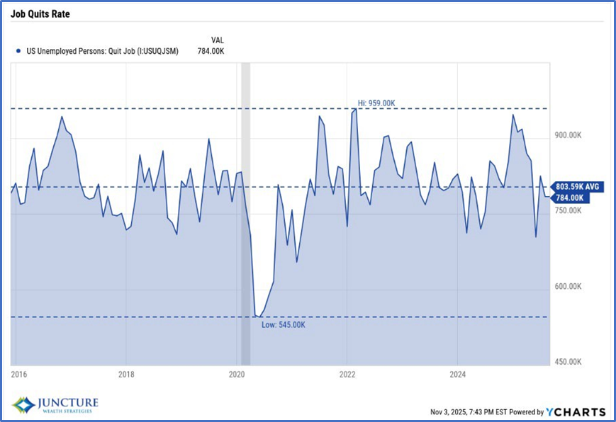 Prior to the federal government shutdown, the US labor market was becoming more balanced. The number of job openings to unemployed workers fell from a very high level of 2.0 to the most recent 0.98; approximately 1 job opening per unemployed worker which is still tighter than the long-term average of 0.72. An important metric is the number of workers quitting jobs. It may indicate workers’ perceptions of the ease of obtaining a new position. As such, low quit rates may portend weaker labor market conditions in the near term. The graph on the right shows the quit rate has declined from a high of almost 959k jobs to a recent of 784k jobs.