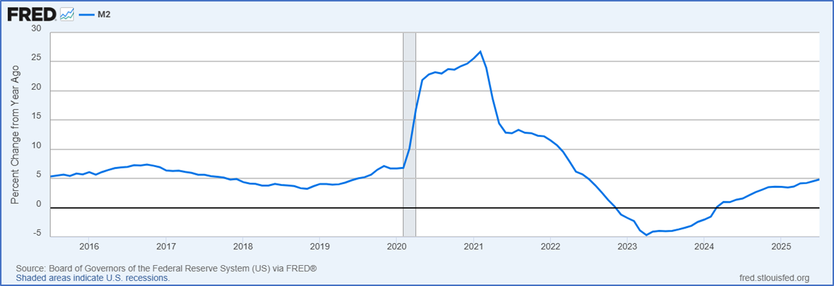 As we have discussed in prior updates, persistent inflation must be reinforced by money supply growth. Over the past year, US M2 has begun to grow at approximately five percent. The M2 money supply consists of value of the following: currency, checking accounts, savings, small denomination time deposits (CDs), and retail money market funds. It can provide a picture of the level of liquidity available to support consumer spending. The current growth rate has returned to normal levels and should allow the economy to grow at a moderate pace without causing excess inflation.
