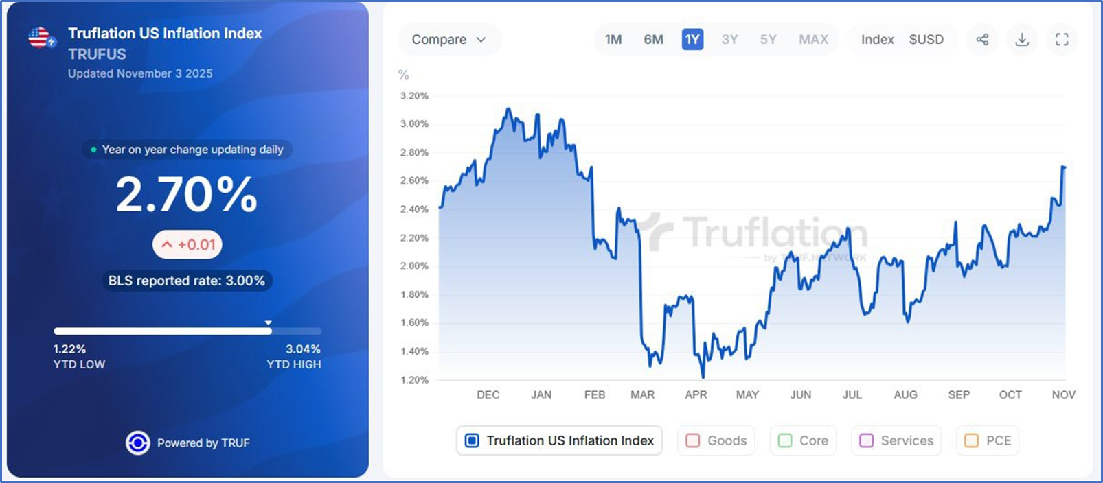 Truflation tracks over 13 million data points nationally provided by 30 data providers to ascertain the best picture of inflation across the US. It segregates these data points into 12 household expenditure categories. It estimates US inflation to be between two and three percent which is close to the Federal Reserve’s inflation target of two percent.
